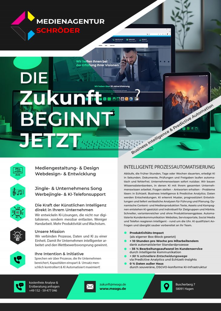 Aktuelle Informationen: Abläufe, die früher Stunden, Tage oder Wochen dauerten, erledigt KI in Sekunden. Dokumente, Prüfungen und Freigaben laufen automatisch und fehlerfrei. Unternehmenswissen sofort nutzbar. Wir bauen Wissensdatenbanken, in denen KI mit Ihrem gesamten Unternehmenswissen arbeitet. Fragen stellen – Antworten erhalten – Probleme lösen: in Echtzeit. Business Intelligence & Predictive Analytics. Daten werden Entscheidungen. KI erkennt Muster, prognostiziert Entwicklungen und liefert verlässliche Analysen für Führung und Planung. Dynamische Content- und Medienproduktion Texte, Assets und Kampagnen entstehen KI-gestützt und individuell für Zielgruppen und Märkte. Schneller, variantenreicher und ohne Produktionsengpässe. Automatisierte Kundenkommunikation Websites, Serviceportale, Social Media und Telefon reagieren intelligent – rund um die Uhr. KI qualifiziert Anfragen und übergibt sauber vorbereitet an Ihr Team.